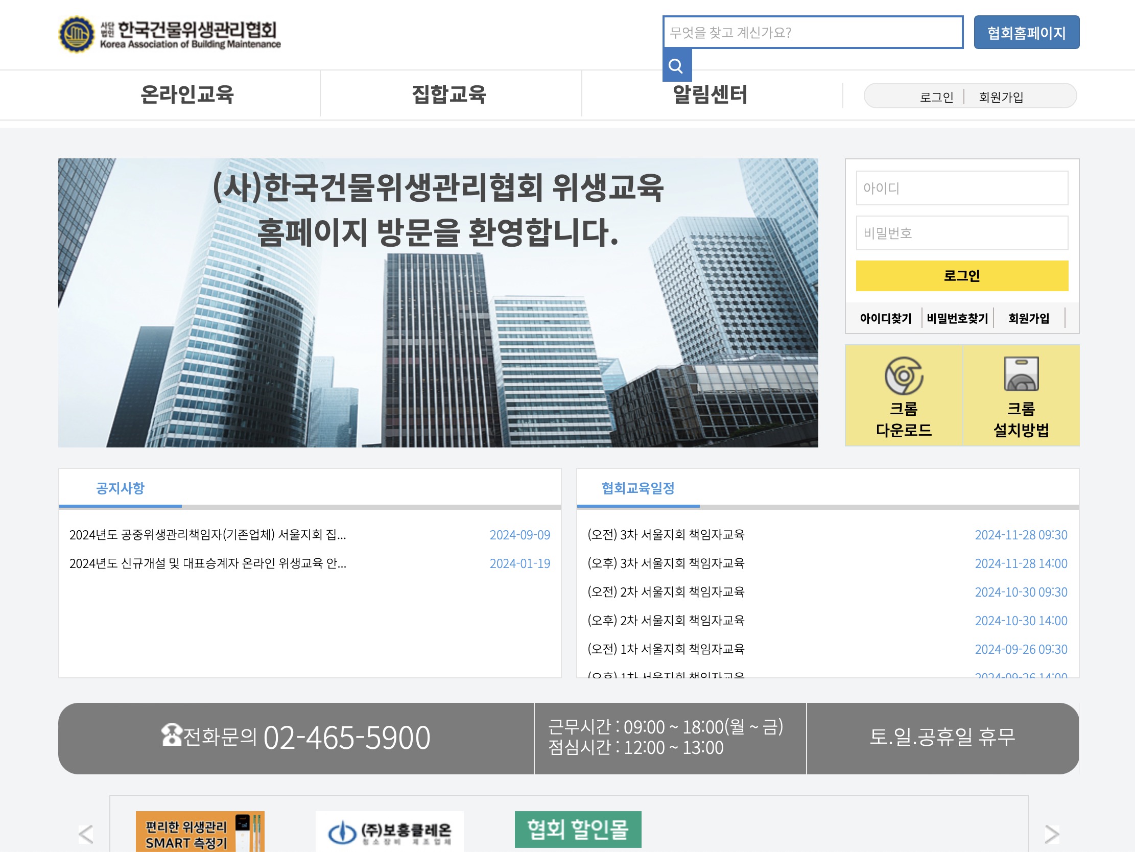 (사)한국건물위생관리협회 위생교육 홈페이지 방문을 환영합니다.